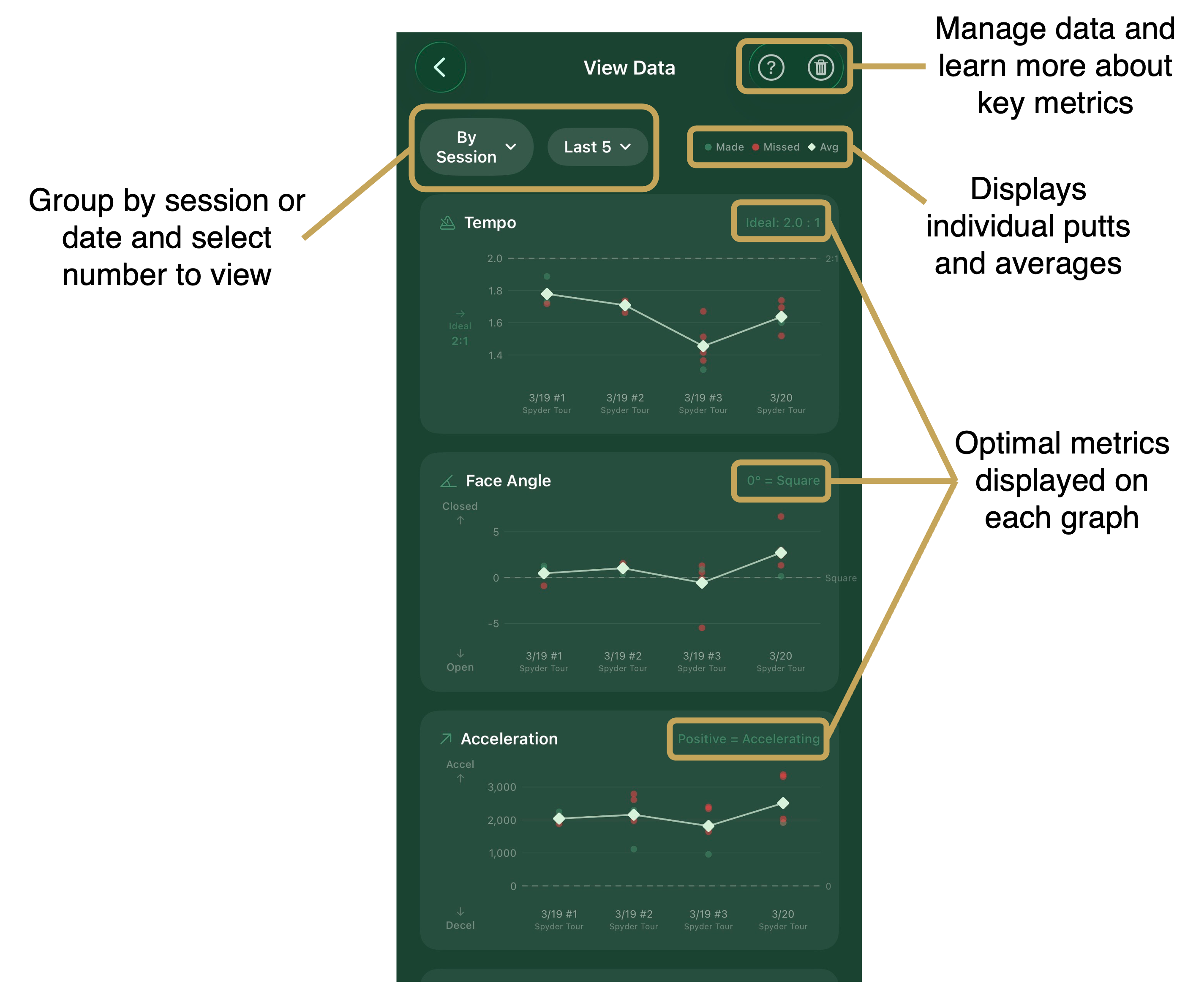 Click on the View Data button on the homescreen to display graphs. Sort by session or by date, manage data, learn more about metrics, and view data to understand what causes you to make and miss putts